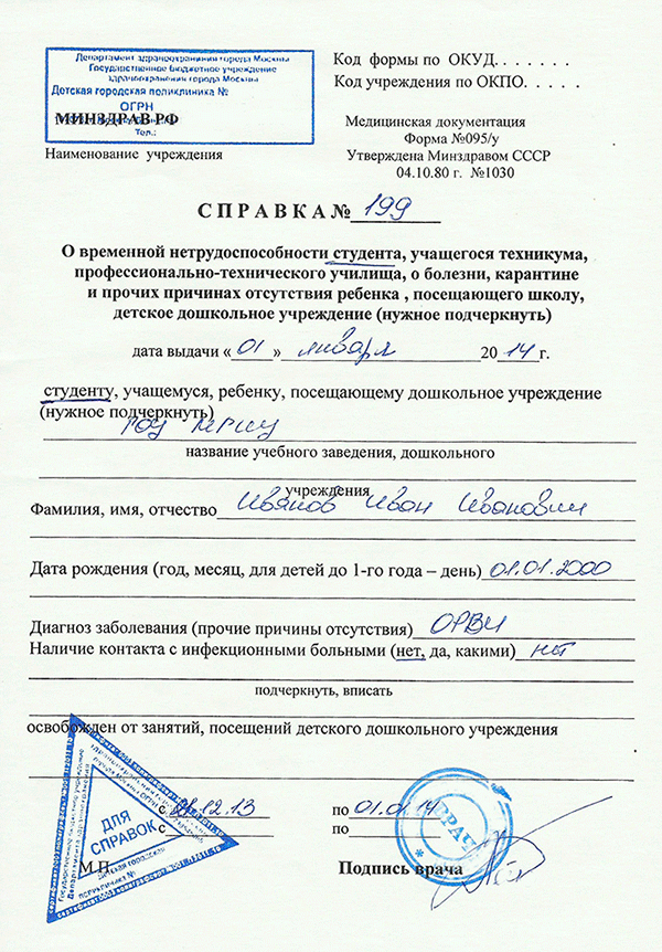 Документ, который подтверждает временную нетрудоспособность школьника или студента называется справка о болезни по форме 095/у. Если Вы по той или иной причине пропустили занятия, то именно предъявив эту справку Вы сможете закрыть свои пропуски. Все мы были студентами и школьниками и помним, что иногда нужно время для себя и для отдыха. Бывают разные жизненные ситуации, некоторые из них предвидеть и запланировать невозможно. Мы помогаем Вам в таких ситуация, у нас Вы имеете возможность купить справку о болезни.